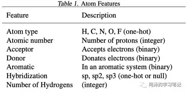 对于分子来说有很多可以提取的特征,比如说原子组成、化学键等,详细的特征列表如下图所示: