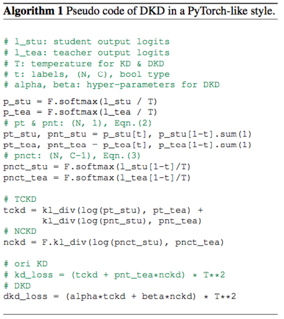 和 KD Loss 相比,该研究将限制 NCKD 的权重 替换为了 ,并给 TCKD 设置了一个权重 。DKD 可以很好地解决刚才提到的两个问题:一方面,TCKD 和 NCKD 被解耦,它们各自的重要性可以独立调节;另一方面,对于蒸馏更重要的 NCKD 也不会再被 Teacher 产生的高置信度抑制,大大提高了蒸馏的灵活性和有效性。DKD 的伪代码如下: