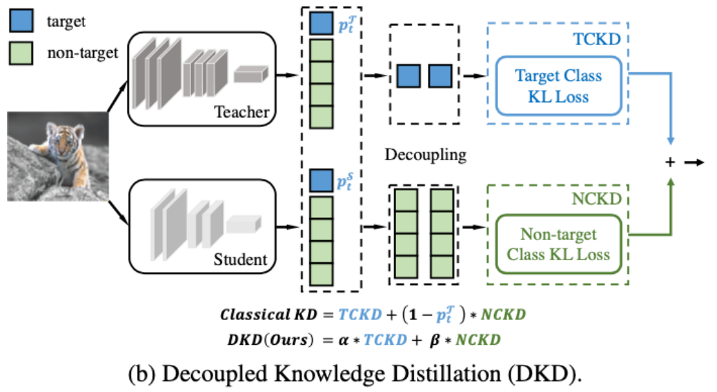 该研究尝试一种拆解的方法来更深入地分析 KD:将 logits 分成两个部分(如图),蓝色部分代表目标类别(target class)的 score,绿色部分代表非目标类别(Non-target class)的 score。这样的拆解使得我们可以重新推导 KD 的 Loss 公式,得到一个新的等价表达式,进而做更多的实验和分析。