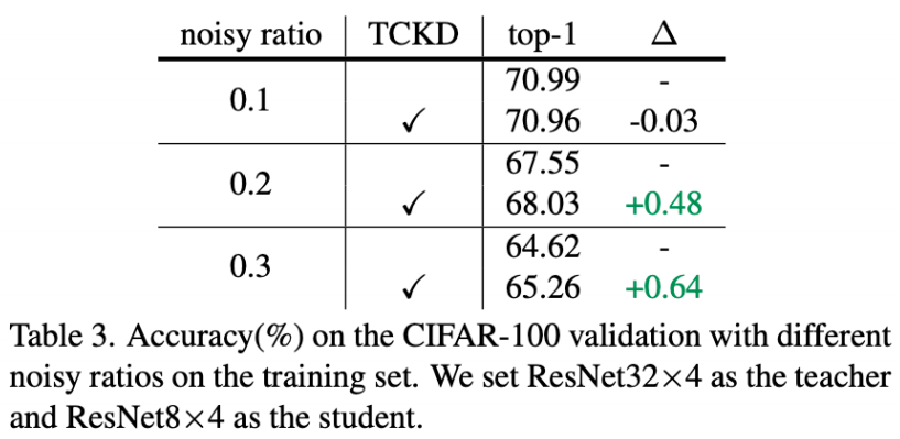 表 3 中,该研究通过控制 noisy ratio 对数据集的标签引入不同程度噪声,ratio 越大表示噪声越大。可以看到,随着数据集的噪声变大,单独使用 NCKD 的效果变得越来越差,同时引入 TCKD 的增益也越来越大。说明在越难学的数据上,TCKD 的作用就会越明显。