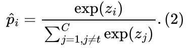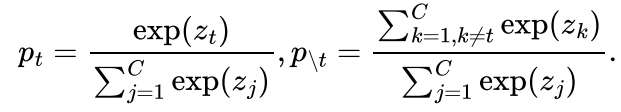 2. 非目标类内部竞争的多分类分布 ,也就是在预测样本为非目标类的前提下每个类各自的概率(总和为 1)。这个概率分布和分类的监督信号是不相关的,换句话说,从这个概率分布中无法得知目标类上的预测置信度,其表达式为: