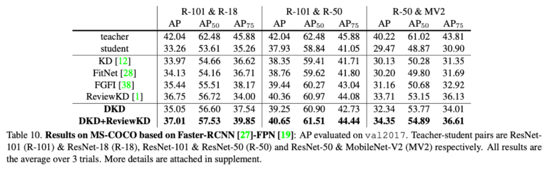 该研究也在目标检测任务(MS-COCO)上验证了 DKD 的性能。如表 10 所示,在 Detector 蒸馏中,DKD 的结果虽不如特征蒸馏的 SOTA 性能,但是依然稳定地超过了 KD 的性能。而将 DKD 和特征蒸馏方法组合起来,也可以进一步提高 SOTA 结果。