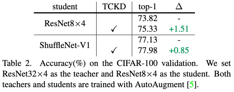 以表 2 中的 ShuffleNet-V1 为例,在使用 AutoAugment 的情况下,训练集难度有了明显提升,此时仅仅使用 NCKD 只能达到 73.8% 的 student 准确率,而同时使用 TCKD 和 NCKD 可以将 student 准确率提升至 75.3%。