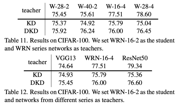 为了证明该观点,研究者也进行了一系列的对比实验。如表 11 和表 12 所示,当使用 DKD 时,大模型蒸馏效果变差的问题被显著改善。该研究希望这一点可以为后续的工作提供一些 insight。