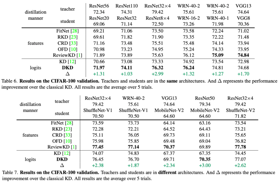 表 6~9 中提供了 DKD 在 CIFAR-100 和 ImageNet-1K 两个分类数据集上的蒸馏效果。和 KD 相比,DKD 在所有数据集和网络结构上都有明显的性能提升。此外,与过去最好的特征蒸馏方法(ReviewKD)相比,DKD 也取得了接近甚至更好的结果。DKD 成功使得 logits 蒸馏方法重新回到了 SOTA 的阵营中。