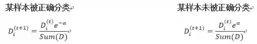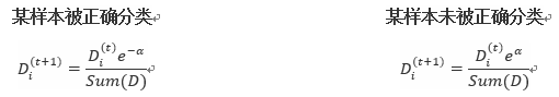 计算出D之后,AdaBoost又开始进入下一轮迭代。Adaboost算法会不断地重复训练和调整权重的过程,知道训练错误率为0或者弱分类器的数目达到用户指定的值为止