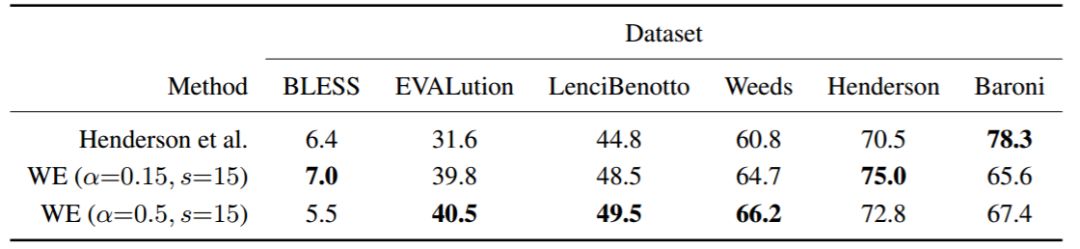 表 2:蕴涵向量(entailment vector)和最佳运输/基于 Wasserstein 的蕴涵测量(WE)之间的比较。得分为 AP @ all(%)。超参数 α 指的是平滑指数,s 指 PPMI 计算中的位移。附录 A 中的表 4 列出了更多数据集。