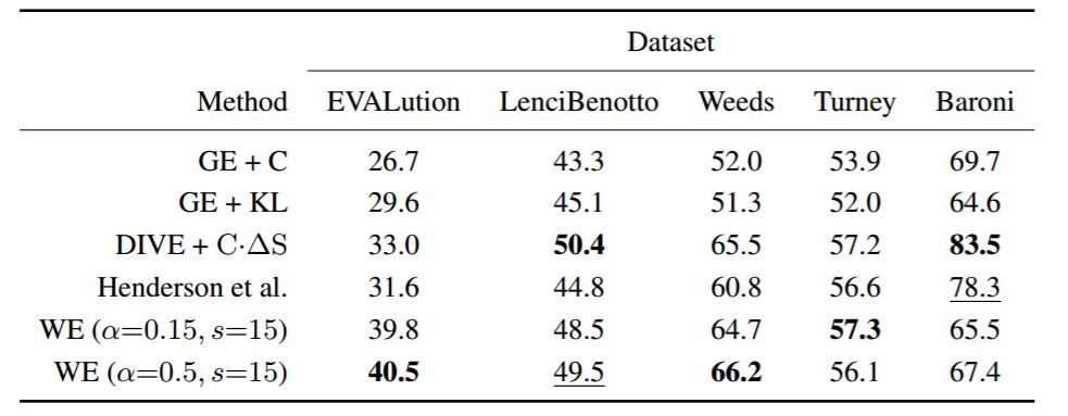 表 3:蕴涵向量,最佳运输/基于 Wasserstein 的蕴涵测量(WE)和其他当前最优方法之间的比较。GE + C 和 GE + KL 分别是具有余弦相似度和负 KL 散度的高斯嵌入。当我们使用相同的评估设置时,GE + C、GE + KL 和 DIVE + C·ΔS 的得分取自 (Chang et al., 2017),分数是 AP @ all(%)。