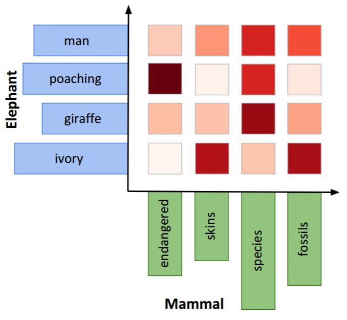 图 1:大象和哺乳动物直方图之间最佳传输的图示。这里,研究者从两个直方图的前 20 个上下文的列表(就 PPMI 而言)中随机选择四个上下文。然后使用正则化的 Wasserstein 距离(如公式(4)所示),绘制所获得的传输矩阵(或通常称为传输图)T,如上所述。