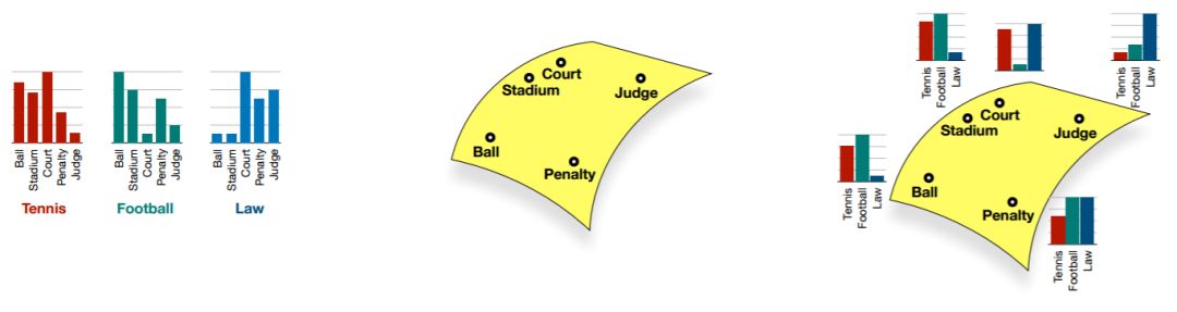 图 2:三个单词的图示,每个单词都有其分布估计(左)、相关上下文的点估计(中),以及联合表示(右)。