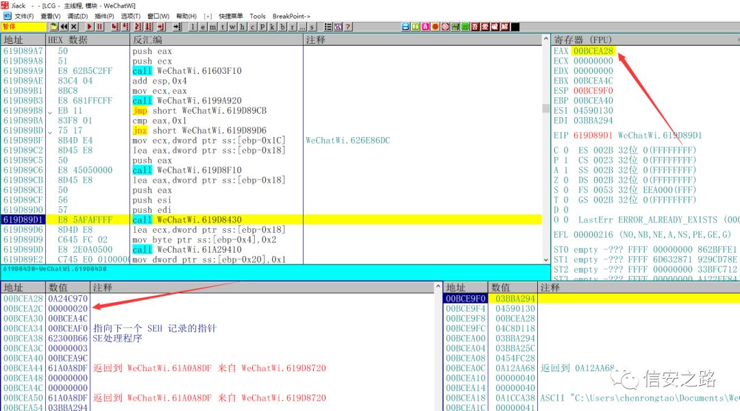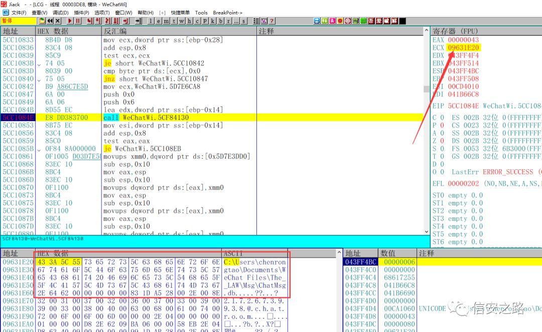 程序断下,此时 ecx 指向数据库文件的路径