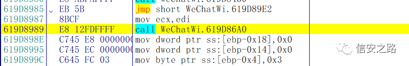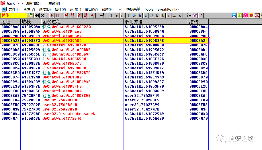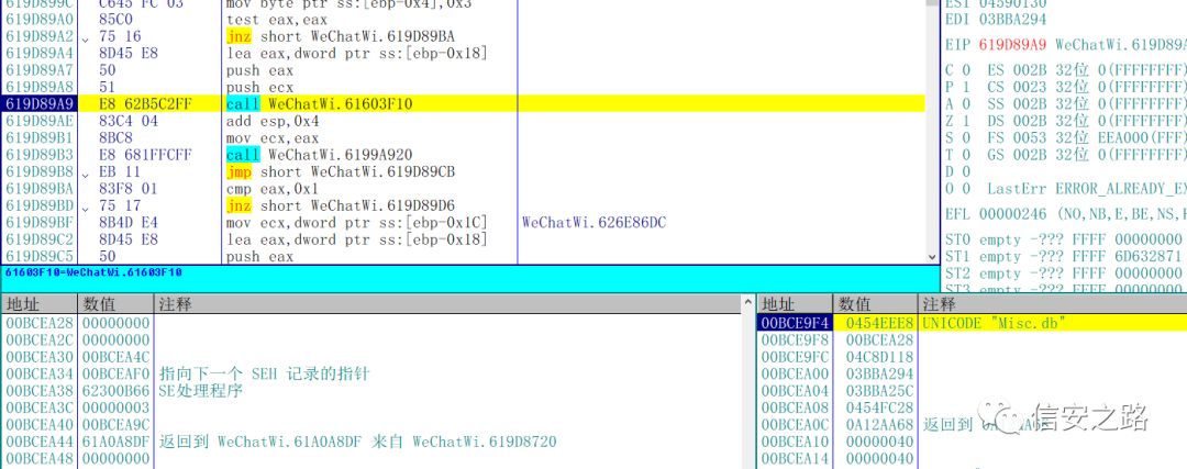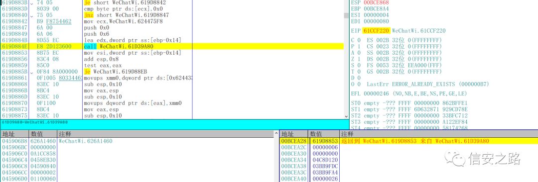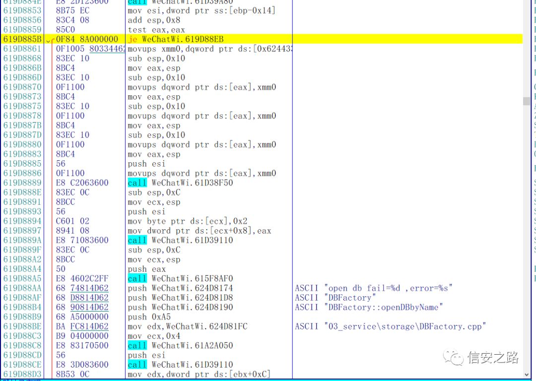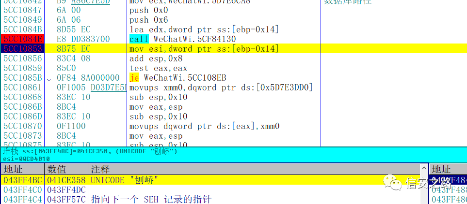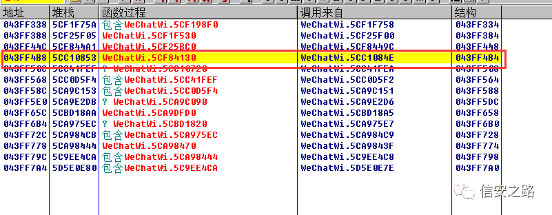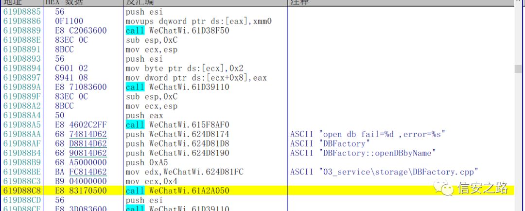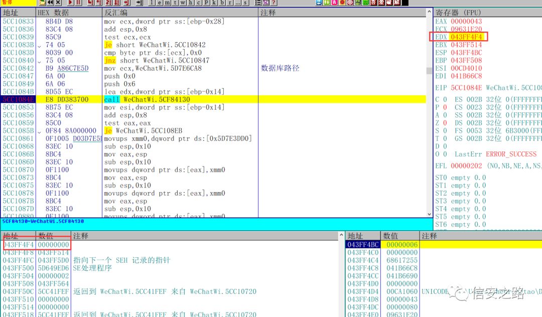 分析一下现在的状况,这个时候微信的数据库处于一个还未初始化,但是即将初始化的状态,我们可以在堆栈或者堆栈附近的地址找到关于数据库初始化相关的函数。然后在微信初始化完数据库之后单步往下跟。这样能省去很多麻烦