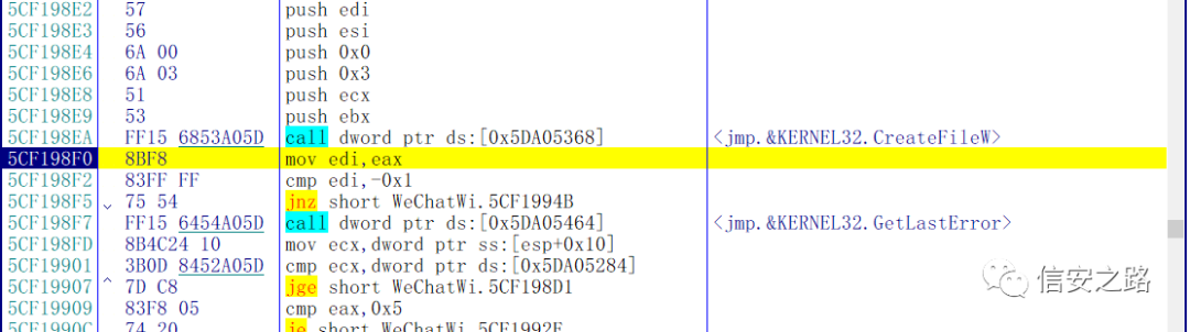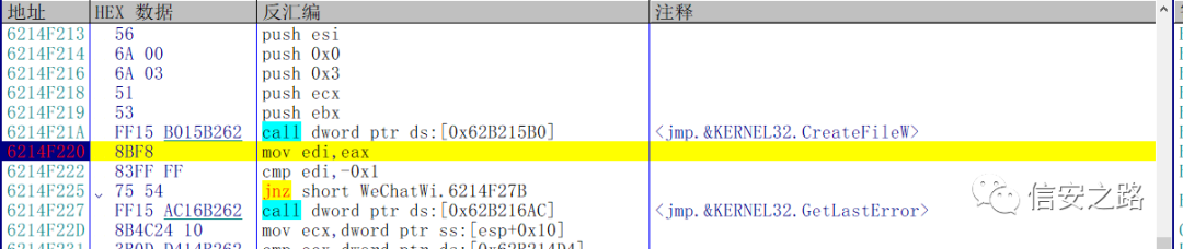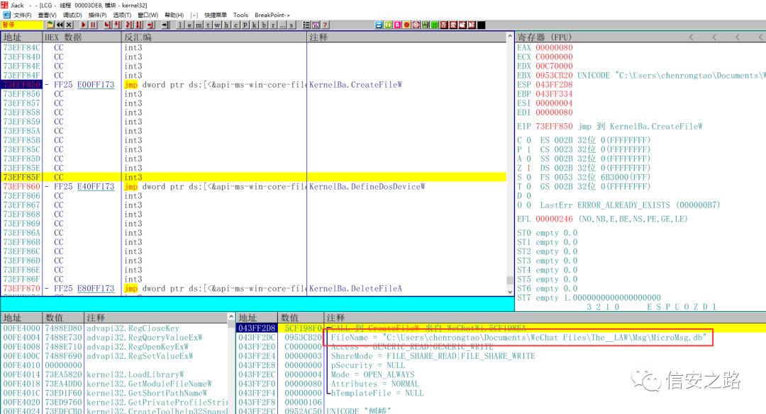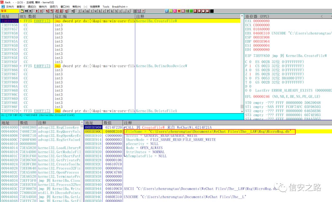 在 CreateFileW 下断,当微信读取数据库文件时让程序断下。