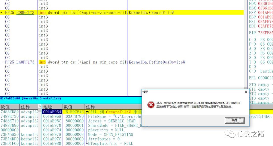 CreateFileW 断点断下来,那么现在应该怎么跟呢?肯定不能一直往下单步,虽然单步也能达到目标。