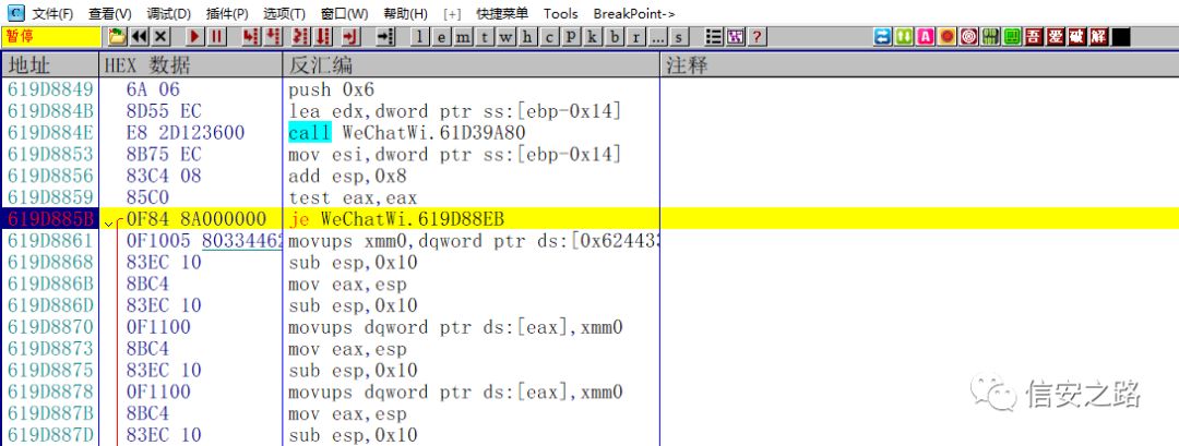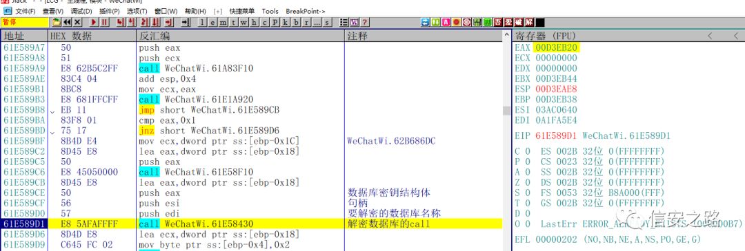 因为微信的数据库文件不止一个,所以我们不需要重启微信。直接在这个函数下断点,然后取消剩下的所有断点,按 F9 运行,程序断下。然后 F8 单步,