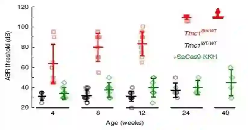 在不治疗的情况下,贝多芬小鼠通常在1个月大时就开始对高频声音反应降低,6个月大时完全失聪。相比之下,出生后不久就接受基因编辑疗法的小鼠,在2个月时与健康小鼠的听力几乎没有差别;到6个月大时,却对低频声音的听力仍保持正常,有些甚至对高频声音的反应也接近健康小鼠。更有甚者,在此后的近一年里保持了稳定的听力!