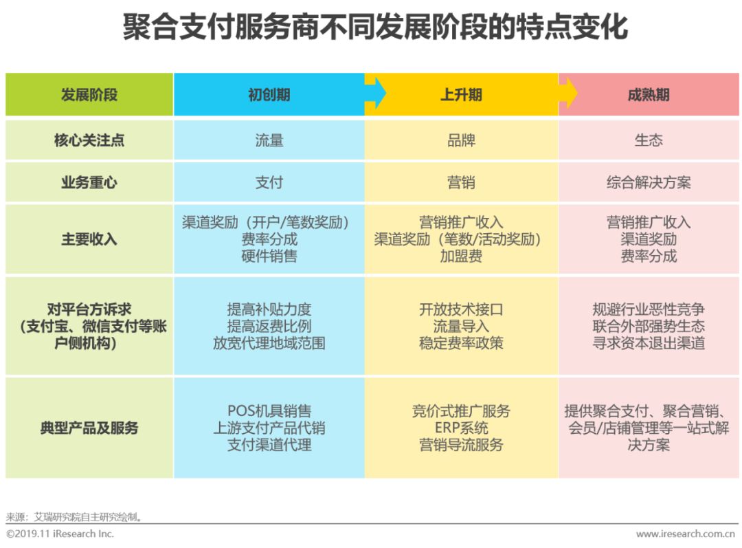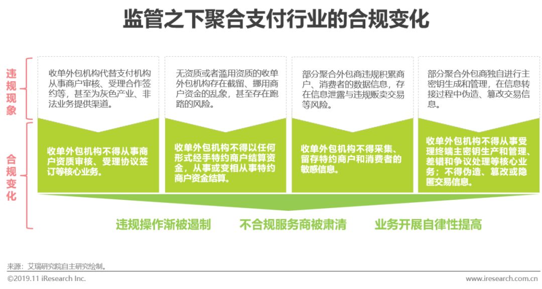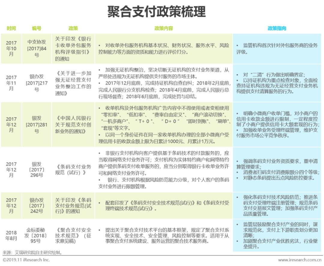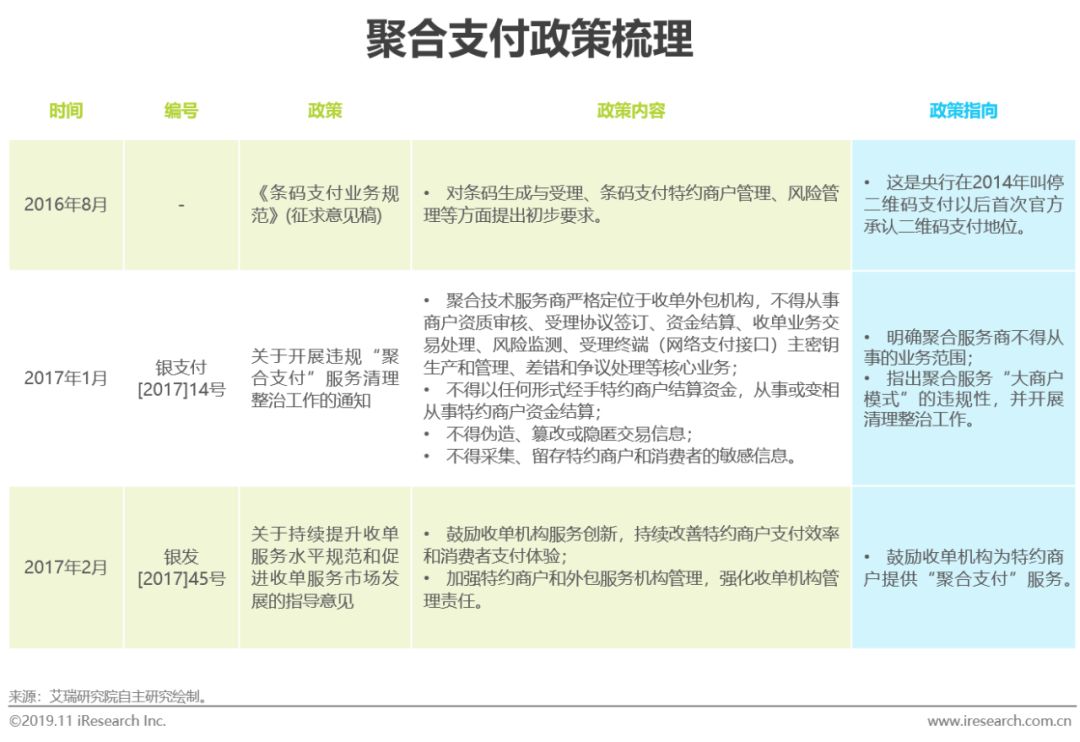 2014年起,随着线下扫码支付的发展,以及支付产品日趋多样化且零散化,提供支付方式一体化整合服务的聚合支付迎来发展机遇。进入2016年以来,聚合支付产品快速迭新且被大范围推广,在上游支付机构激烈竞争的推动下,聚合支付规模爆发;从2017年下半年开始,聚合支付监管政策陆续出台,严查“二清”,行业发展走向健康合规。
