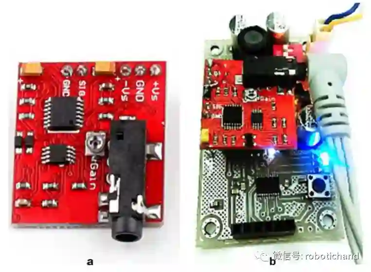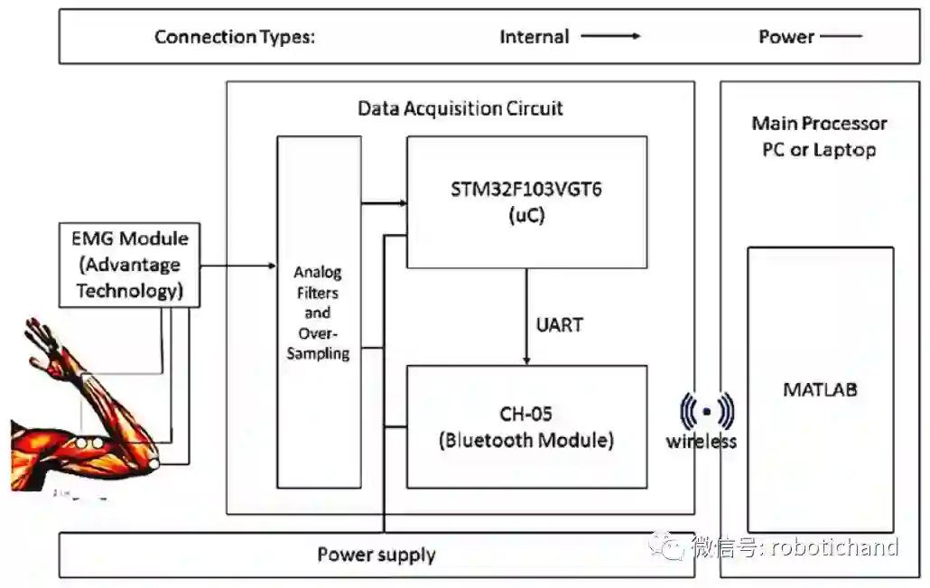 2)生肌电控制(EMG控制),采集肌肉运动时其表面附近产生的微弱变化信号;