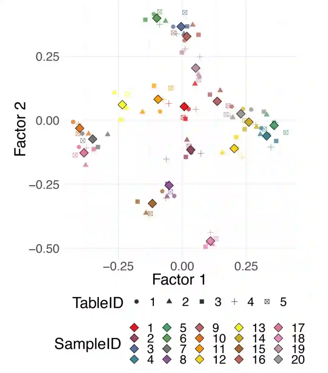 所以的数据集都可以投影到这个共识空间。单个数据集的投影可以帮助观察来自不同领域的数据所描述的观察中的不同模式。图7显示了DiSTATIS在5个模拟距离表上对20个合成数据点的使用示例。不同的颜色对应不同的数据点,不同的形状对应不同的距离表。数据表之间的“折中点”用较大的菱形标记表示。有关多表数据分析的详细研究,重点是生物多组学数据集,可以请参见Meng及其同事的相关研究结果。