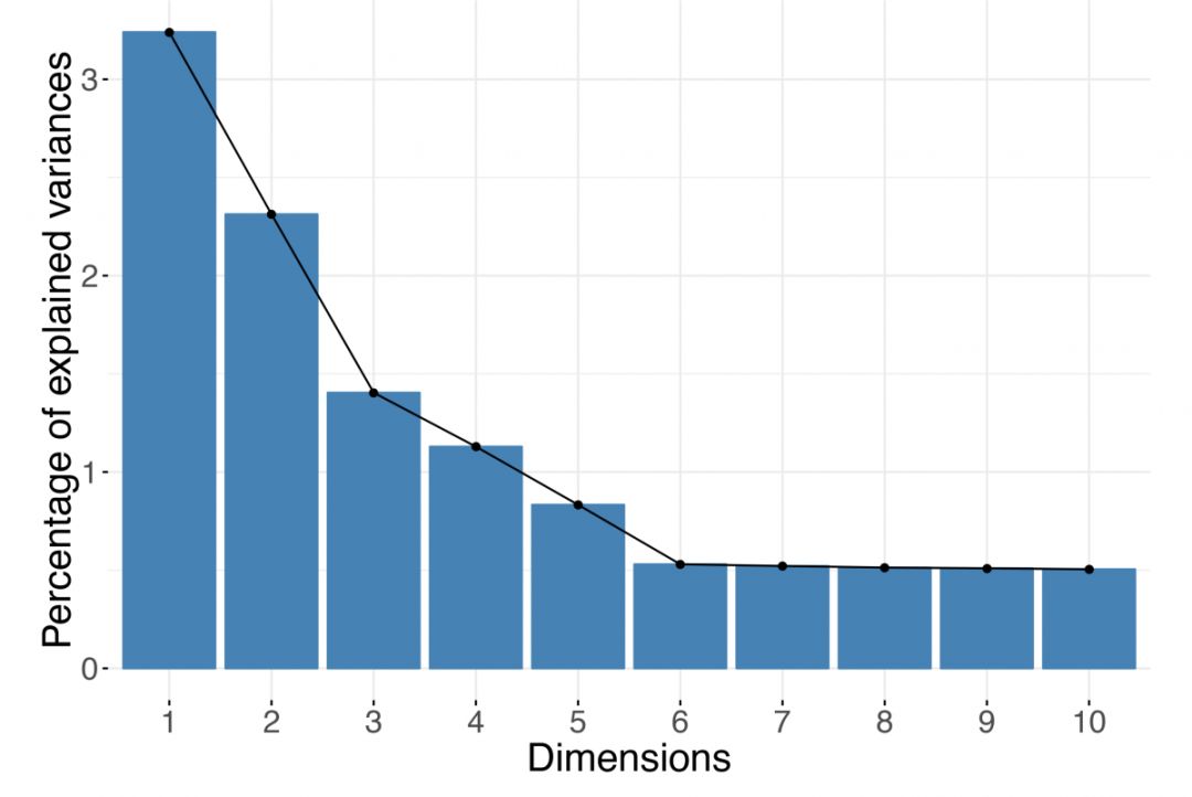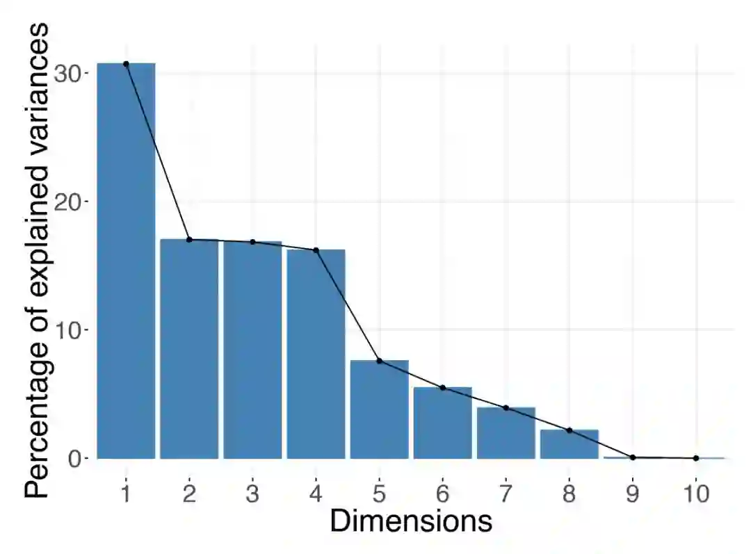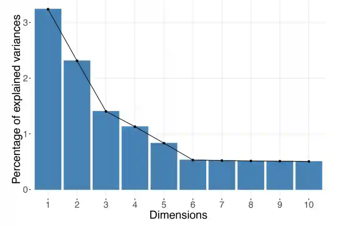 在对数据进行降维时,关键问题是选择一个合适的新维度的数量。这一步决定了能否在在降维后的数据中捕获到感兴趣的信号,降维时维度数量的选择在统计分析或机器学习任务如聚类之前的数据预处理步骤中尤为重要。即使你的主要目标是进行数据可视化,但是由于可视化时一次只能显示两个或三个轴,你仍要选择降维后要保留的合适的新维度数量。例如,如果前两个或三个主成分对方差的解释不足时,就应该保留更多的成分,在这种时候就需要对成分的多种组合进行可视化(例如,成分1与成分2,成分2与成分4,成分3与成分5之间的对比等)。在某些情况下,最强信息是一个复杂的因子,并且有用的信息被高阶成分捕获。在这种情况,就必须使用高阶成分来显示其模式。