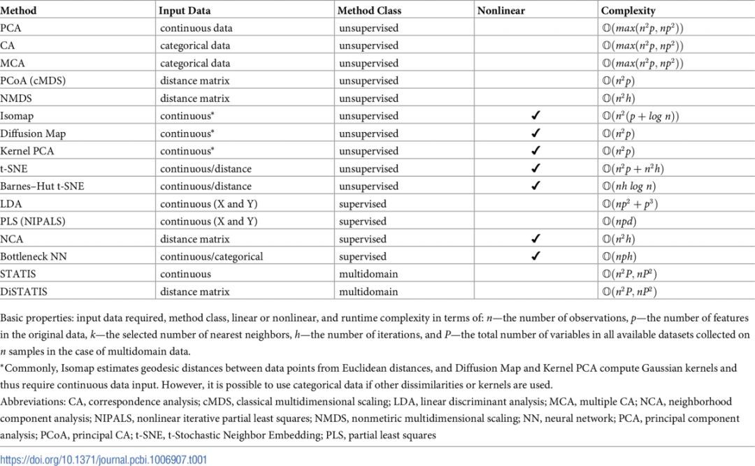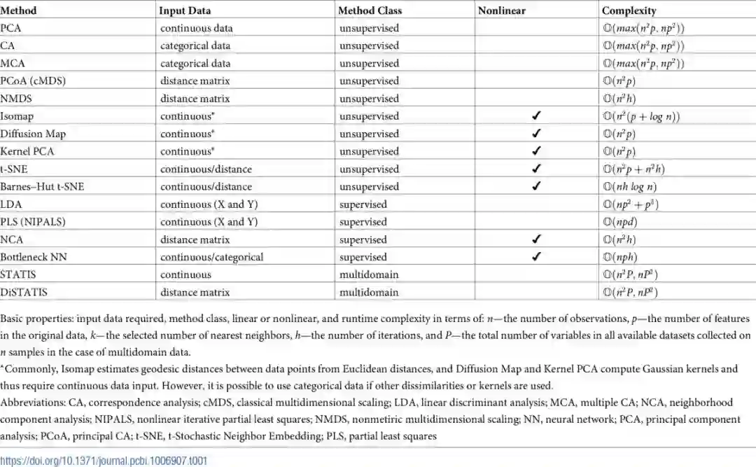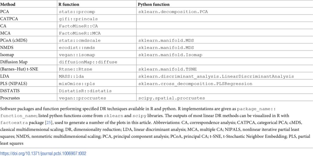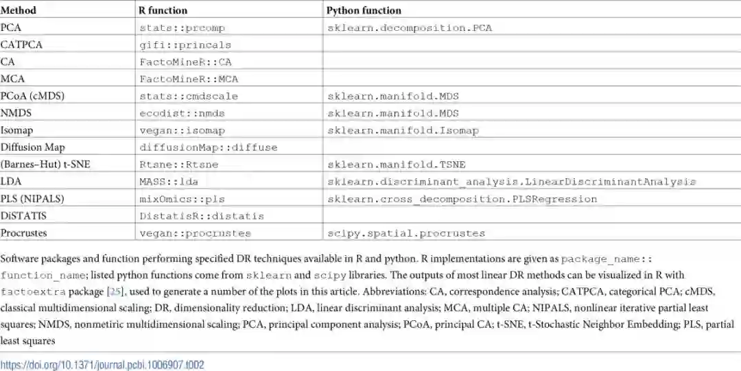 对于收集多领域数据的情况,例如基因表达、蛋白质组学以及甲基化的数据,你可能需要先将降维技术分别应用到每张数据表中,然后再使用普鲁克变换(Procrustes transformation,相关链接:https://onlinelibrary.wiley.com/doi/abs/10.1002/bs.3830070216)或是其他可以将多个数据集整合的方法,如用于多个表的联合分析方法(称为STATIS);和用于多个距离矩阵的联合分析(称为DisTATIS,相关链接:)(详细信息请参考技巧9)。表1给出了降维技术的基本属性的分类和总结。为了帮助从业者,我们也把本文讨论过的降维技术的实现方法总结到表2中。
