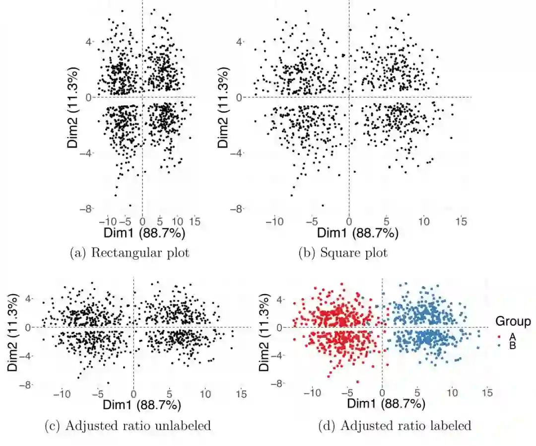 我们用图2所示的模拟示例来说明宽高比问题。在矩形(图2A)和正方形(图2B)图中,宽高比与PC1和PC2坐标的方差不一致; 结果是明显地将数据点(错误地)分组到图表的顶部和底部。相反,图2C,垂直两轴的长度比与相应特征值之间的比率一致,因此可以显示正确的分组,与真实的分类一致。