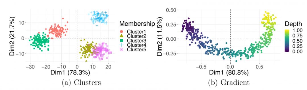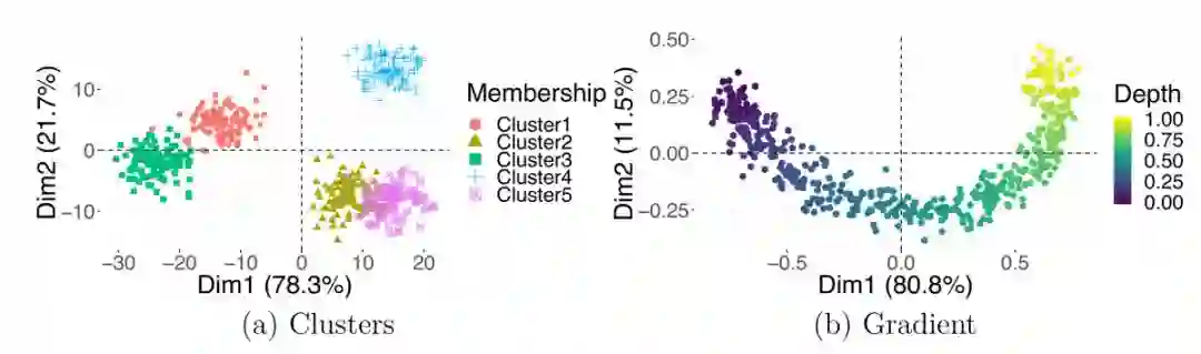 与离散集群不同,数据中的连续变化不太容易被识别。了解如何识别和准确解释潜在梯度非常重要,因为它们经常出现在与未知连续过程相关的生物数据中。当数据点没有分离成不同的聚类,而是从一个极端向另一个极端逐渐移动时,梯度就出现了;它们通常在数据降维的可视化中以平滑曲线的形式出现。值得注意的是,当PCA和cMDS(PCoA)应用于涉及线性梯度的数据时,数据点通常以呈现出马蹄形或弓形。当相关特征向量由于计算中使用的数据协方差或距离矩阵的性质而呈现特定形式时,特别是当这些矩阵可以表示为中心对称的Kac-Murdock-Szego矩阵时,PCA和cMDS图中就会出现“马蹄效应”。