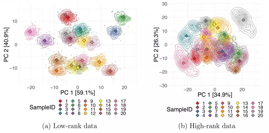 此外,可以通过构建“引导”数据集来估计与观察点相关的不确定性,即用替换方法重采样观察点以生成数据的随机子集。“引导”集可以看作是多路数据,使用技巧8中描述的STATIS或Procrustes对齐方法匹配随机子集。当数据的真实噪声模型可用时,可以生成数据点的副本,而不需要使用自举子样本。通过扰动样本的测量值,并应用技巧9中提到的STATIS或DiSTATIS方法生成“折中方案”和每个受干扰的数据副本的坐标。获取每个数据点的多个估计值后就可以估计它的不确定性。你可以使用密度等值线或通过将每个引导程序投影中的所有数据点绘制到折中方案上来显示DR嵌入图上每个样本的不确定性。图9表示两个模拟数据集的PCA投影的Procrustes比对。彩色线表示自举子集输出坐标的密度等值线,菱形标记对应于全部数据的投影坐标。图中绘制了20个合成数据点,这些数据点分别来自2维高斯分布和5维高斯分布,均正交投影到10维。我们可以观察到低秩数据点的不确定性要小得多,即前2个PC能更好地代表第一个数据集。
