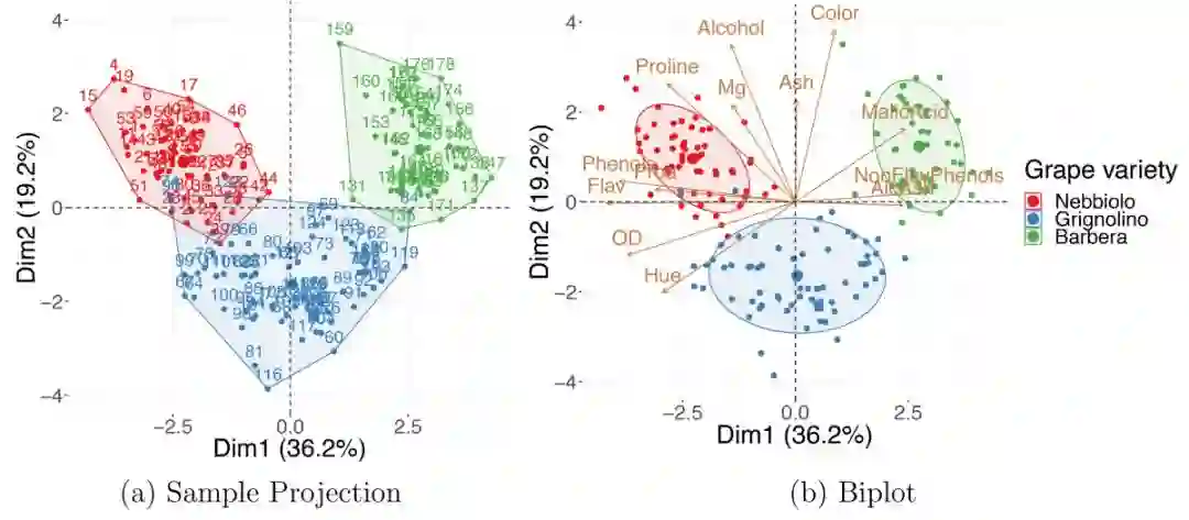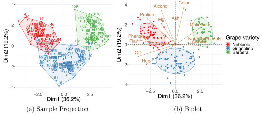 (a)对葡萄酒数据集的PCA样本投影显示,根据葡萄酒的特性,葡萄酒往往与葡萄品种分类一致:内比奥罗(Nebbiolo)、格里诺利诺(Grignolino)和巴贝拉(Barbera)。(b)主成分分析双标图(biplot)可以用来找出哪一组葡萄酒具有较高的哪一种性质。Dim1,维度1;Dim2,维度2;主成分分析。