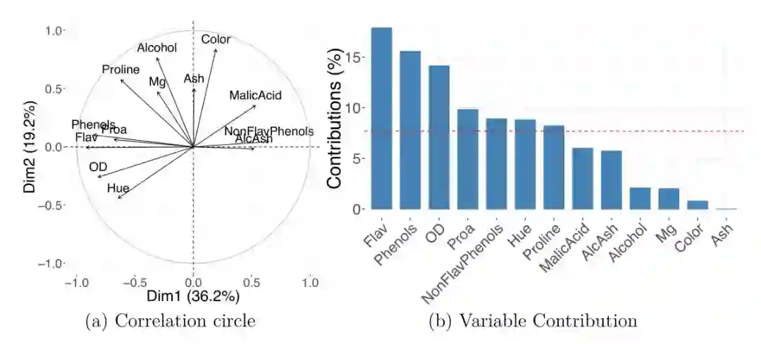 葡萄酒数据集上的PCA显示了怎样用变量的表示来理解新维度的含义。相关性圆图(a)和PC1贡献图(b)。AlcAsh,灰分的碱度; Dim1,维度1; Dim2,维度2; Flav,黄酮类; NonFlav Phenols,非黄烷类酚类; OD,OD280 / OD315稀释的葡萄酒; PC,主成分; PCA,主成分分析; Phenols,总酚类; Proa,原花青素。