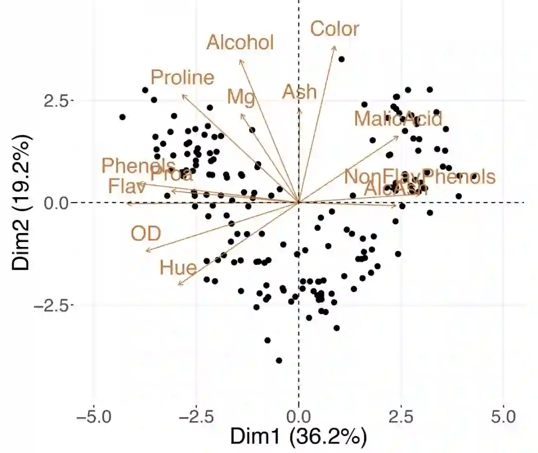 葡萄酒数据集的单时隙图将样本和变量的投影组合到前两个主成分中。AlcAsh,灰分的碱度; Dim1,维度1; Dim2,维度2; Flav,黄酮类; NonFlav Phenols,非黄烷类酚类; OD,OD280 / OD315稀释的葡萄酒; PCA,主成分分析; Phenols,总酚类; Proa,原花青素。