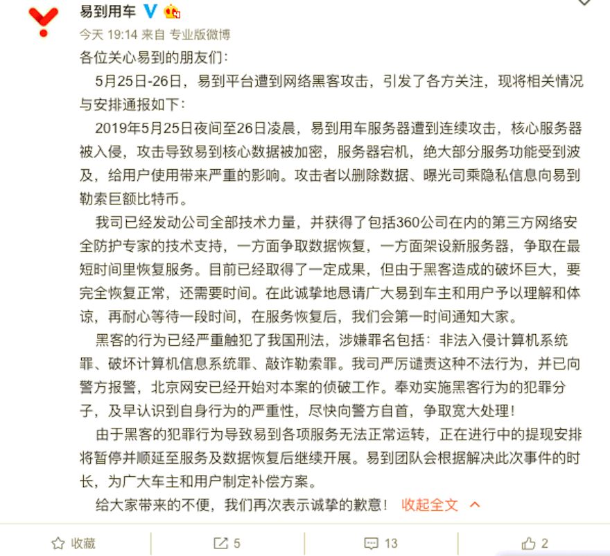 2019年5月25日夜间至26日凌晨,易到用车服务器遭到连续攻击,核心服务器被入侵,攻击导致易到核心数据被加密,服务器宕机,绝大部分服务功能受到波及,给用户使用带来严重的影响。攻击者以删除数据、曝光司乘隐私信息向易到勒索巨额比特币。