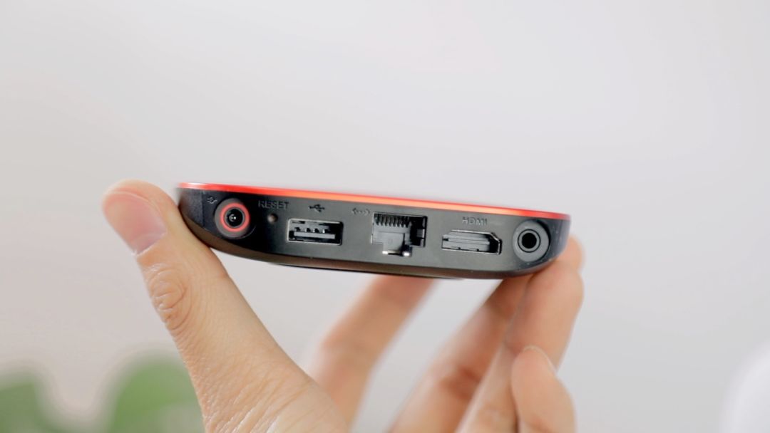 整机非常小巧,也很漂亮。背面接口除了电源口以外还有 HDMI、USB、以及有线网络接口,3.5mm AV 口,也就是可以直接接音箱和耳机或者通过 AV 线连接老电视,接口丰富。