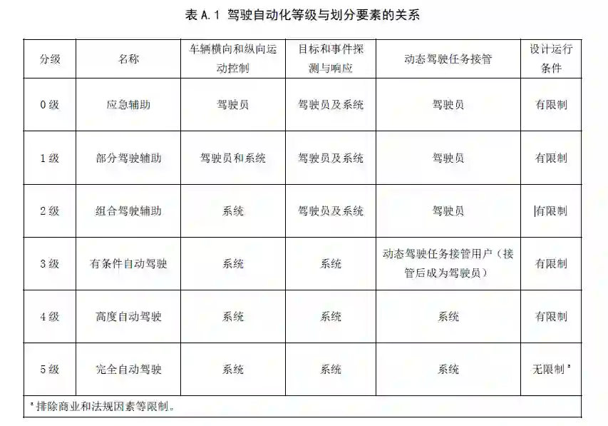 2021年8月19日,由全国汽车标准化技术委员会组织国内外十余家汽车企业、历时3年共同编制的《汽车驾驶自动化分级》标准正式发布,该标准清晰的定义了从应急辅助、部分驾驶辅助、组合驾驶辅助、有条件自动驾驶、高度自动驾驶到完全自动驾驶的6个级别,将于2022年3月1日正式开始实施。