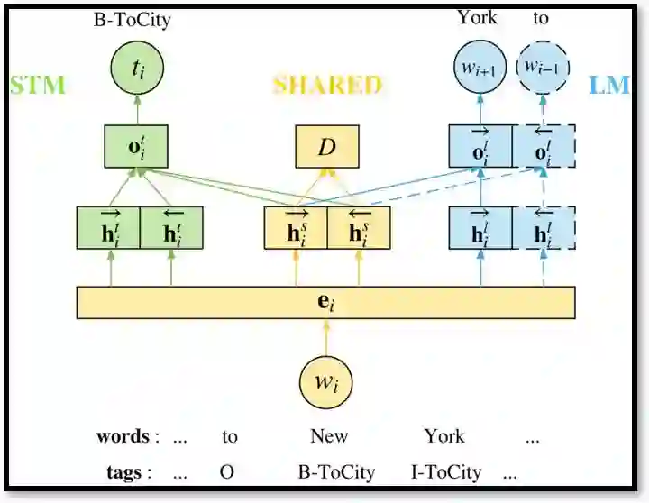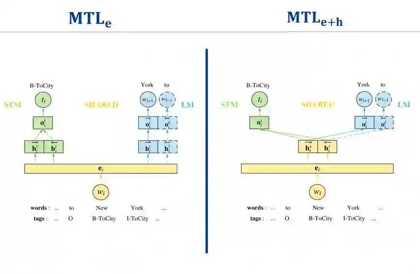为了更好地利用无标注数据,多任务学习框架把 SLU 模型和语言模型结合在一起。SLU 模型从有限的标注数据中学习监督知识,同时语言模型从大量无标注数据中学习一般无监督知识。如此,语言模型获取的信息可以提高 SLU 模型在测试数据上的性能。下图是应用于语义理解的简单多任务学习框架。其中,蓝色的部分为语言模型,来学习一般语言信息,虚线部分为双向语言模型所有的额外的反向语言模型;绿色的部分为 SLU 模型,来学习监督知识;黄色的部分为两个共享的空间。这两个框架分别完全分离或共享隐层空间。