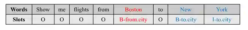 口语语义理解模块是目标导向的口语对话系统的重要部分,它把用户的语句解析为对应的语义信息。例如,句子「Show me flights from Boston to New York」可以被解析为 (fromloc.city name=Boston, toloc.city name=New York)。这通常被认为是一个语义槽填充(slot filling)任务,对句子中的每个字都分配一个预先定义的语义标签。在 In/Out/Begin (IOB) 模式下,这个例子可以被表示为: