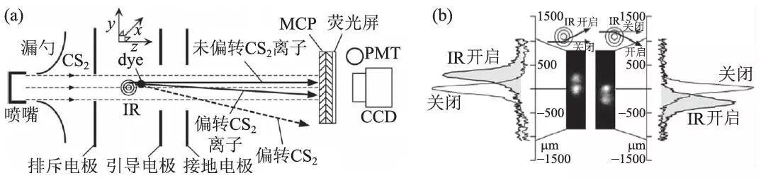 图7 分子束激光偏转、聚焦的(a)实验装置与(b)结果