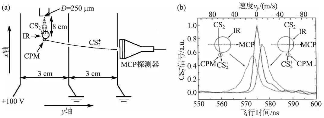 1997年,H. Stapelfeldt 等报道了利用非共振激光偶极力对分子进行偏转的实验,如图6 所示。一束脉冲的CS2分子束通过聚焦的红外光束(IR)焦点。实验通过对CS2 分子的多光子电离飞行时间质谱(TOF)探测发现,在非共振光学偶极梯度力的作用下,光束焦点附近的分子横向速度发生了改变,分子的运动方向产生了偏转。