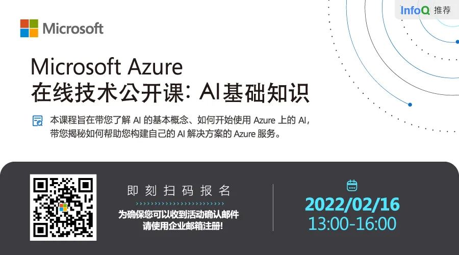 为了帮助广大渴望进阶的职场小白扫除进阶障碍,帮助数据工程师和 IT 专业人员建立更为系统的认知,微软即将在 2022 年 2 月 16 日 13:00-16:00,推出《Microsoft Azure 在线技术公开课: AI 基础知识》,带领渴望进阶的开发者一起突破 AI 基础知识关卡。即刻点击【阅读原文】或【扫码】抢座啦!