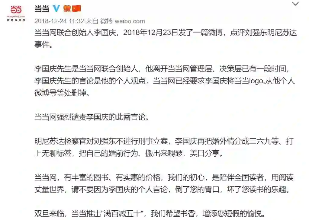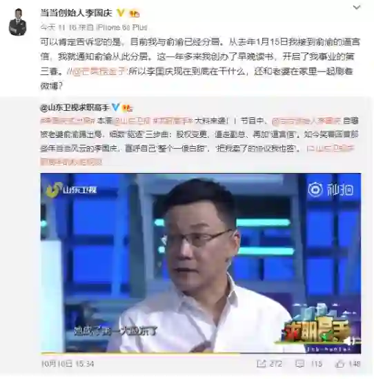 俞渝当即用当当官博发表了一段文字,撇清当当与李国庆的关系,实名diss,估计恨不得说自己不认识李国庆。