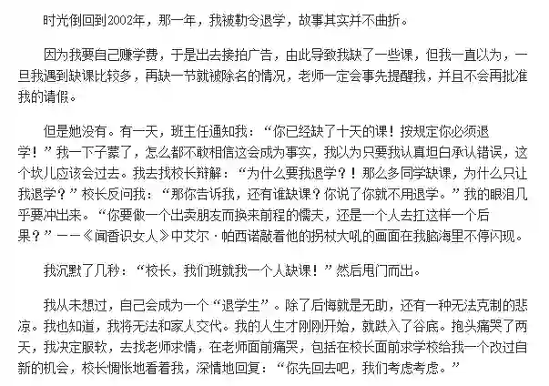田朴珺大学读的是中戏,因为私下接广告赚钱,导致旷课过多,被勒令退学。她去找校长理论,校长说,只要她若能找出另一名跟她旷课次数一样多的学生,便撤销退学处分。