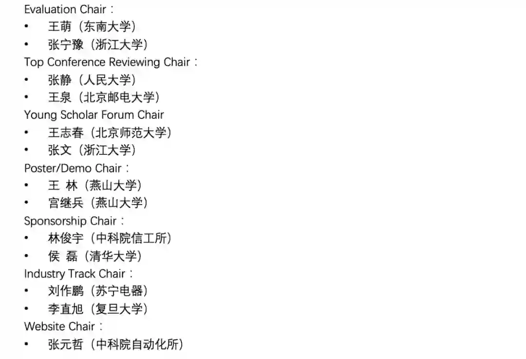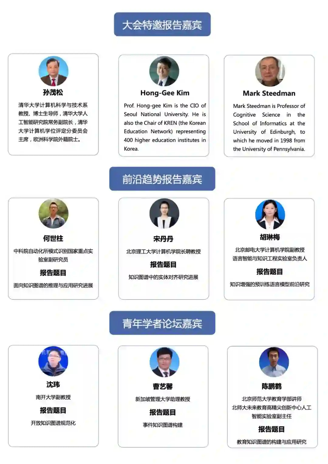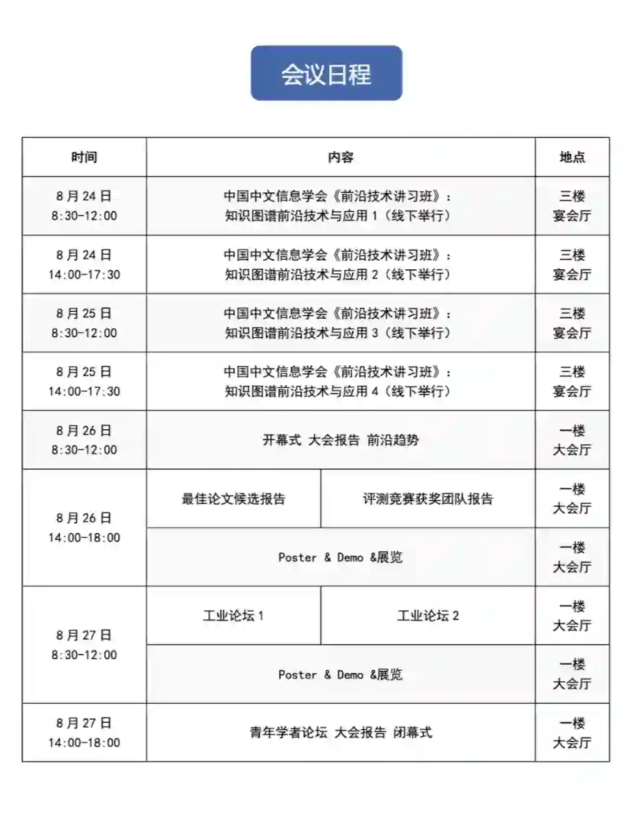 会议将包括学术讲习班、大会特邀报告、工业界论坛、评测与竞赛、知识图谱顶会回顾、海报与系统展示及学术论文报告等环节。大会将邀请国内外知名学者讲授相关领域的最新进展、发展趋势和实战经验,工业界论坛将邀请产业界的主要研发人员分享经验,促进产学研合作。