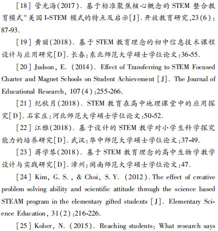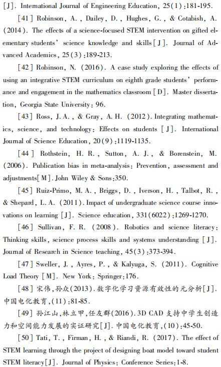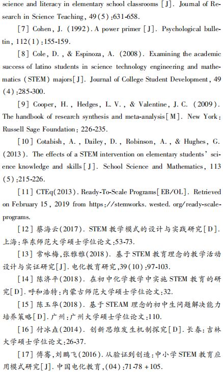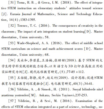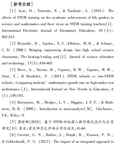第三种结论全面否定了STEM教学对创造力的影响。例如,卡维耶蒂等(Cervetti et al.,2012)以937名小学生为研究对象,开展以阅读理解、科学写作为主题的STEM教学结果显示,小学生的创造力没有显著变化。汤斯(Townes,2016)的研究同样表明,STEM教学并未显著提升初中生的学习态度、创造力水平。