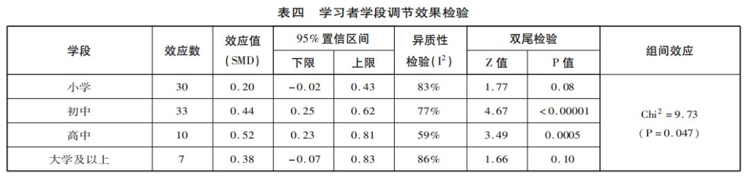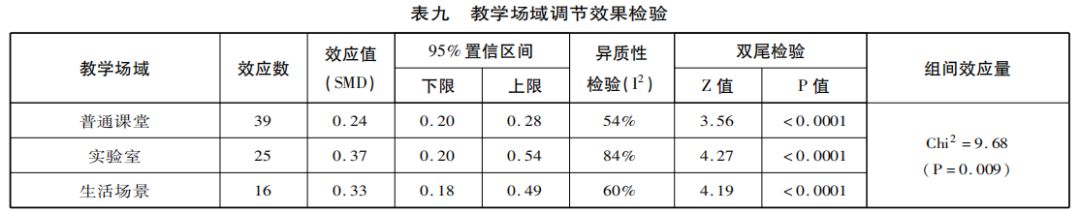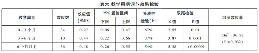 不同教学周期对创造力的调节作用差异显著,组间效应,P=0.032<0.05(见表六)。效应值排序显示,实验周期愈长,STEM教学对创造力的影响效果愈明显。持续6个月以上的教学,对创造力的提升作用达到中等程度(SMD=0.48);3-6个月的教学效果稍差(SMD=0.44);低于3个月的教学,创造力培养绩效仅达到较低水平(SMD=0.27)。这与罗宾逊等的研究结果一致,即学生创造力的受影响程度与教学周期正相关(Robinson et al.,2014)。