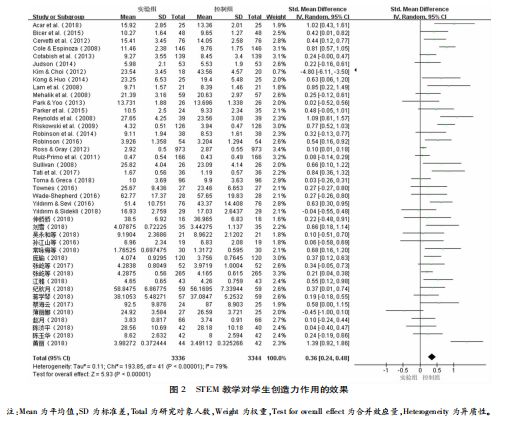 元分析结果表明,STEM教学能激发创新思维及创造行为。其作用机制可理解为:STEM整合相互分离、割裂的学科知识,使学生按照关联、动态、系统的方式理解世界,在发散思维—聚合思维的迭代循环中发展创新思维(Park&Yoo,2013)。同时,STEM教学通过面向真实情境的复杂问题,引导学生经历完整的科学求证过程(Tati et al.,2017),从中获得创新实践的直观体验、非良构知识、科学理性及自我管理策略。此外,STEM教学能通过协作活动,支持不同认知水平、思维特征和知识背景的学生进行自我表达,在互通情感和相互激励中建立自我认知,塑造创新人格与心理。