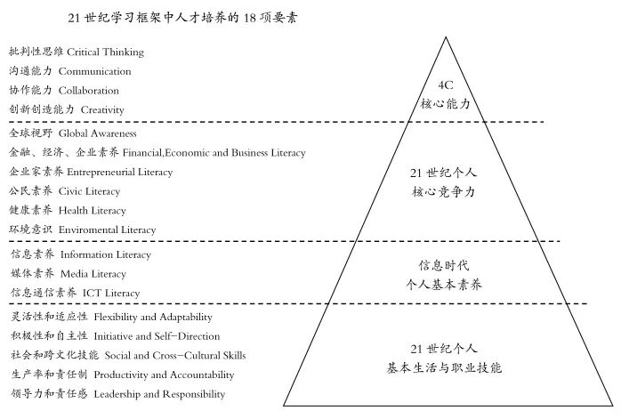 为了满足21世纪劳动力市场的需求,2002年,美国教育部与部分有社会影响力的企业成立了“21世纪技能联盟(P21)”,对21世纪美国公民应具备的技能,展开了整体而系统的研究,最终制定了基础教育 “21世纪学习框架”(Framework for 21st Century Learning),即美国“21 世纪核心素养”[11]。该框架提出未来人才需要具备的18项要素,如图1所示[12]。然而,人们逐渐意识到“21世纪学习框架”过于复杂,进而指出,“4C核心能力”是21世纪最重要的能力,也是未来人才培养的关键目标。