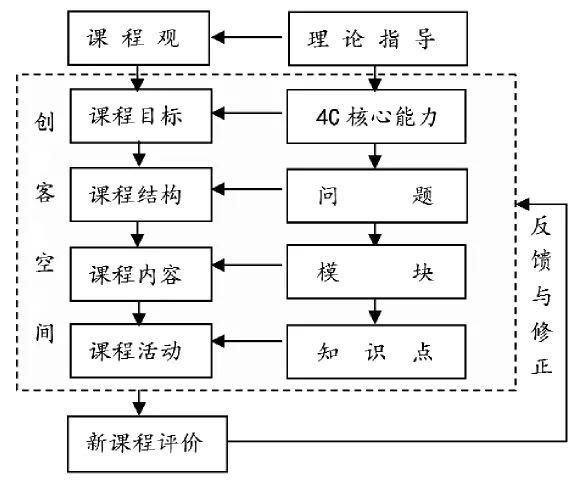 基于“4C能力”培养的创客课程,作为实施创客教育的重要载体,其在课程观、课程目标定位、课程结构的组织、课程内容的选择、课程活动的开展、课程效果的评价方式等方面,与传统课程都存在显著差异。它是对传统课程体系的重构,需采用自上而下的开发方法,在新课程观的指导下,提供时空跨界的创客空间供课程开展实施。即从智能时代需要学生掌握的“4C核心能力”出发,提出课程目标;围绕解决真实问题的原则,以主题形式构建课程结构,模块作为其基本组织单位,由一系列的跨界知识点构成,成为课程内容的来源;课程活动以群体跨界的组织形式开展实践探究与小组协作活动,将知识点的综合运用贯穿活动的始终;最终要对开发的课程进行动态评价,进一步改进和完善。