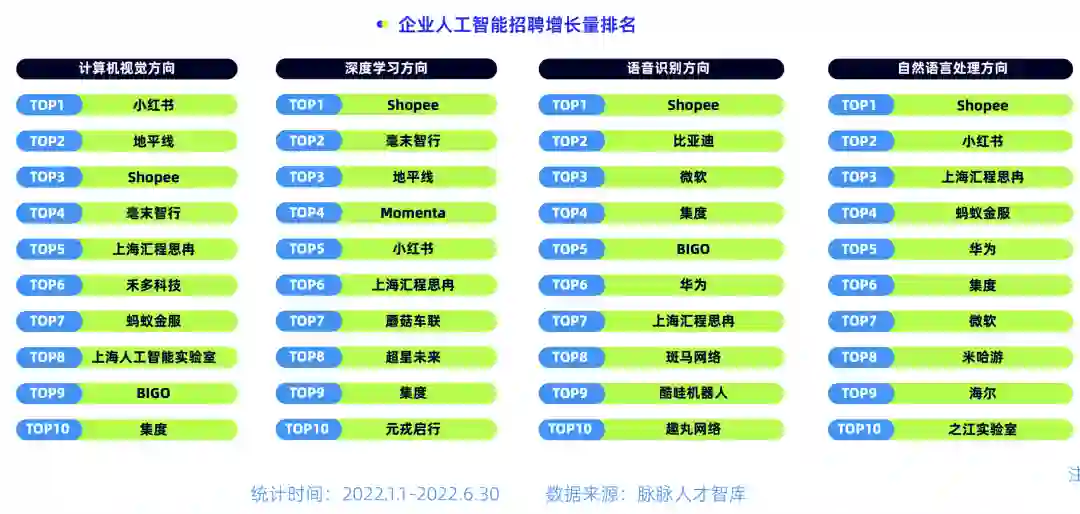 AI人才招聘增长的企业中,小红书和跨境电商Shopee在四大方向上是招聘增长量最高的企业。