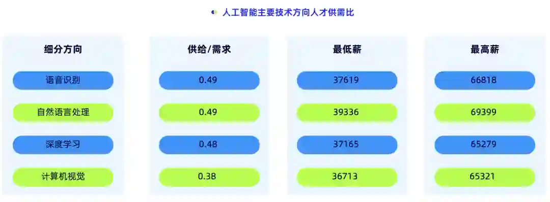 数据显示,在语音识别、自然语言处理、深度学习、计算机视觉这4个技术方向的人才供需比分别为0.49、0.49、0.48、0.38。