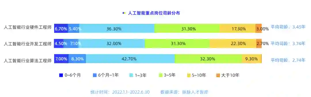 通过对比,算法工程师平均工龄为4.59年,开发工程师和硬件工程师相对工作年限较长,平均工龄分布为6.69年和5.36年。